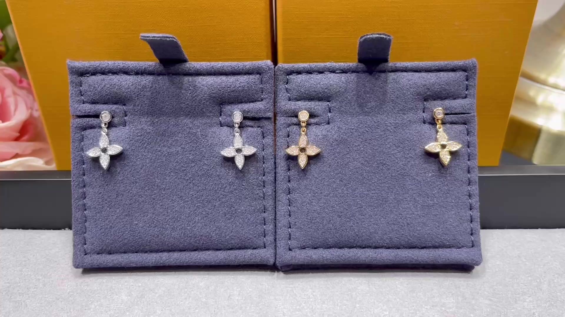 V金材质 514B40 LV二花光金➕钻耳钉。花瓣部分以精致细腻的线条勾勒出优美的轮廓,并将双花组合成一个和谐统一的形状😍。完美的精巧做工,即能展现高贵气质又能保持长时间的色泽不变。